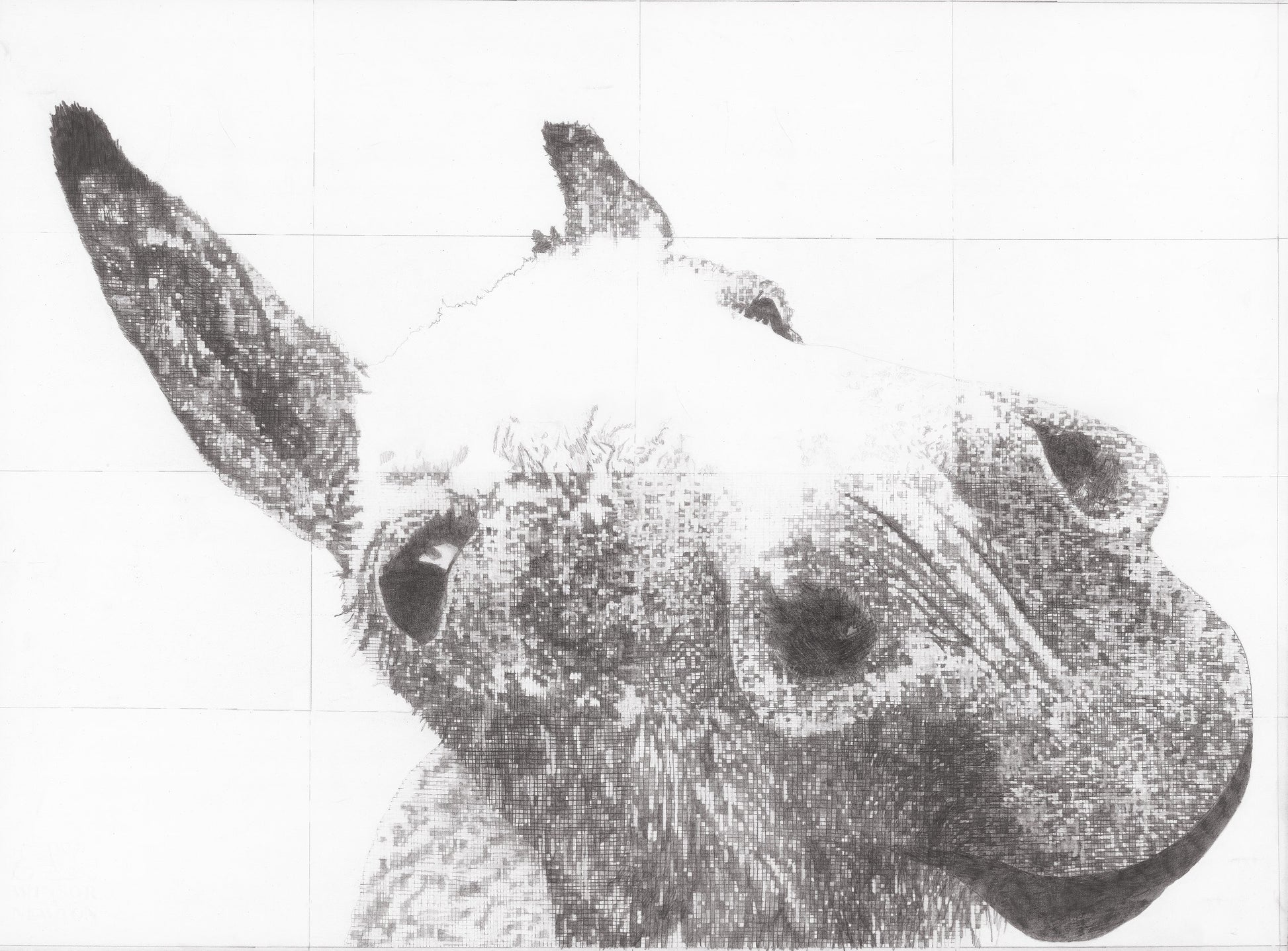 Dolly was created using my own unique drawing process of adding, shading and removing layers of tiny squares over an initial drawing. Please see close ups of photographs to get the full effect. She is drawn in 3B pencil on 300gsm hot pressed professional watercolour paper.
