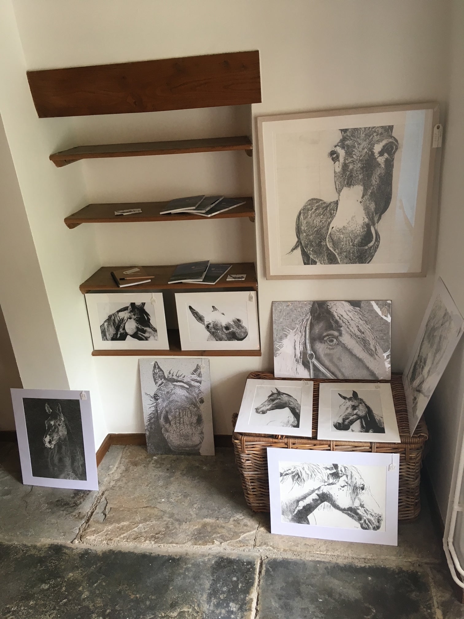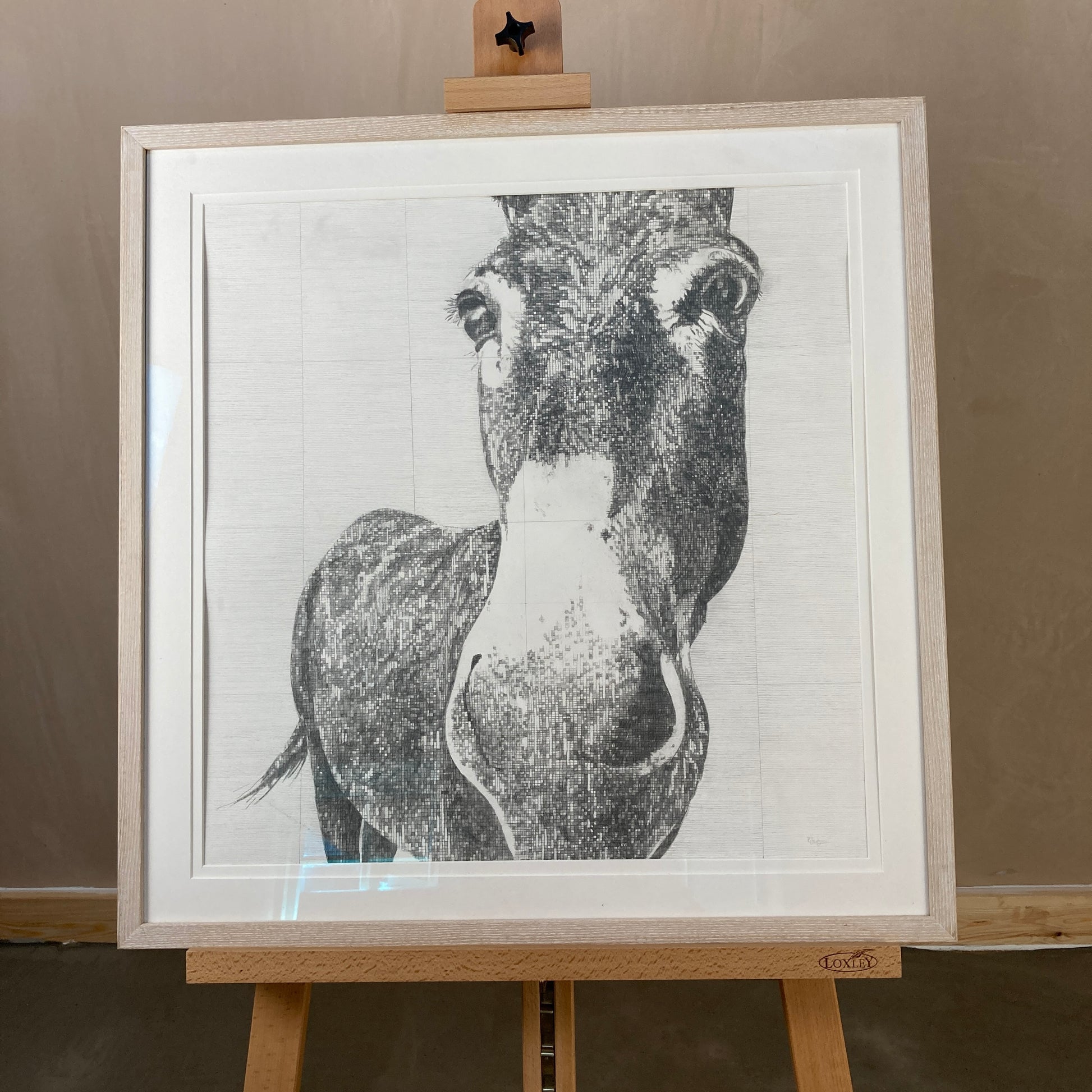 Large original framed drawing of a donkey, Elizabeth.